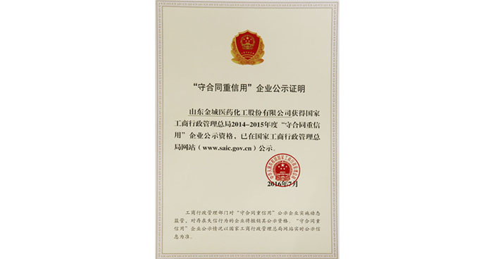 日前,公司收到國家工商總局“守合同重信用”企業公示證明文件,金城醫藥正式獲評國家級“守合同重信用...更多